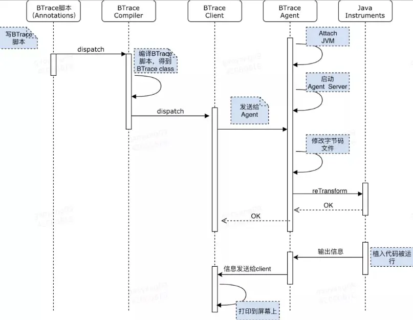 跟java源码一样,先编写Btrace脚本(也是java文件),编译(compiler),通过client发送给agent,agent通过attach api添加到JVM并启动agent server来接收client发送过来的内容,然后底层是使用ASM修改字节码文件,之后使用Java Instrument的retransform接口替换修改后的class文件,运行后的输出再通过agent发送到client进行显示。