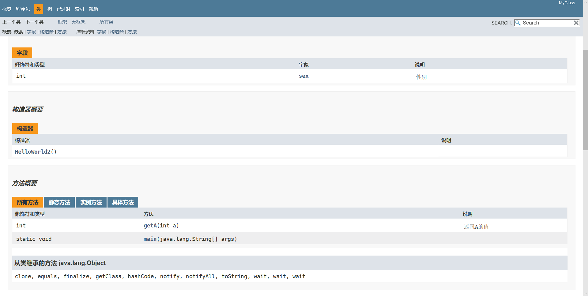 命令2:javadoc -d apiDoc -windowtitle API -doctitle Study -header MyClass -version -author test test2