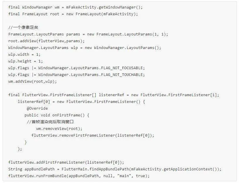 优先加载渲染耗时的 Flutter 首帧 FlutterView的首帧渲染耗时较高,在Debug版本有明显感受,大概会黑屏2秒,release版本会好很多。但我们观察Cpu曲线,发现还是一个较为耗时的过程。有一种体验优化的思路是,我们可以预先让将要使用的 FlutterView 加载好首帧,这样,在真正使用的时候就很快了,可以先建立一个只有1个像素的窗口,在这个窗口里面完成FlutterView首帧渲染,代码如下: