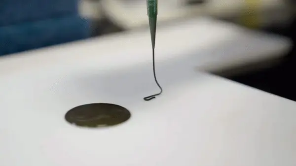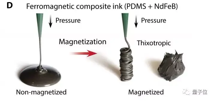 不同于熔融的热塑性聚合物的常规挤压,3D打印不需要通过加热来溶解、流化油墨。磁化油墨的剪切稀化(假塑性)表现使得复合油墨在加压后能轻松挤出,并且屈服应力的存在能使油墨保持形状,形成一条线,而不是变成一滩糊糊。