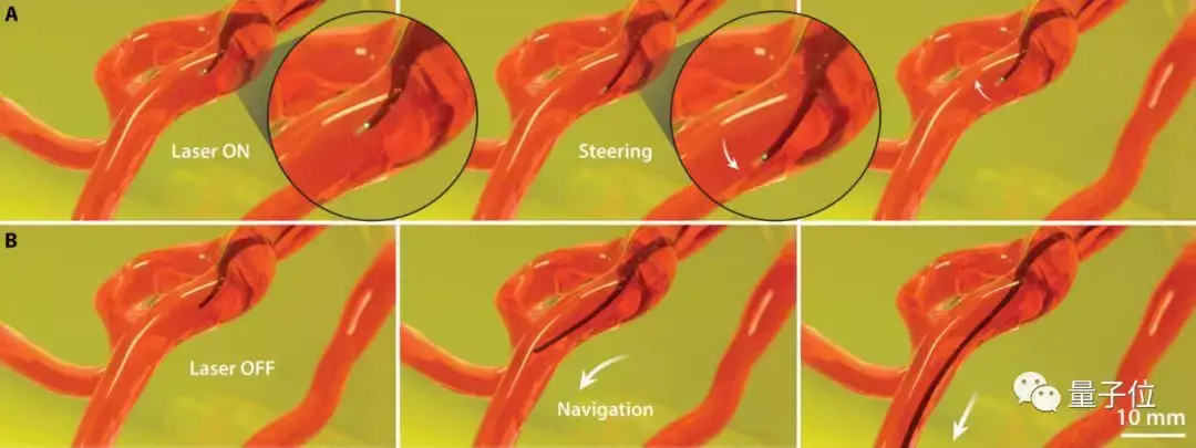 从前,医生直接动手插入导管,碰到急转弯就很难操作,进度缓慢;而磁驱动的机器人,头部可以快速转向,更顺利地到达目的地。