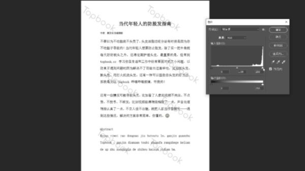以这张被加上水印的文本图片为例,导入 PS,在菜单栏点击【图像】-【调整】-【色阶】,或者直接使用快捷键 Ctrl+L,调出色阶对话框。摁住亮处的滑块向左移动,你可以看到水印逐渐消失,直到完全看不见之后,松开滑块,点击确定。