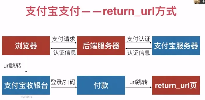 原理: 用户通过浏览器向后端服务器发送请求,后端服务器向支付宝服务器做个通信(支付宝服务器)来获取认证信息,后端服务器把认证信息返回给前台,前台可以带参数(url跳转)调到支付宝收银台,等用户登录/扫码付款成功以后,支付宝跳到(url跳转)return-url页面(指的是后端页面)在后端处理完后,通过js跳转到前端页面上