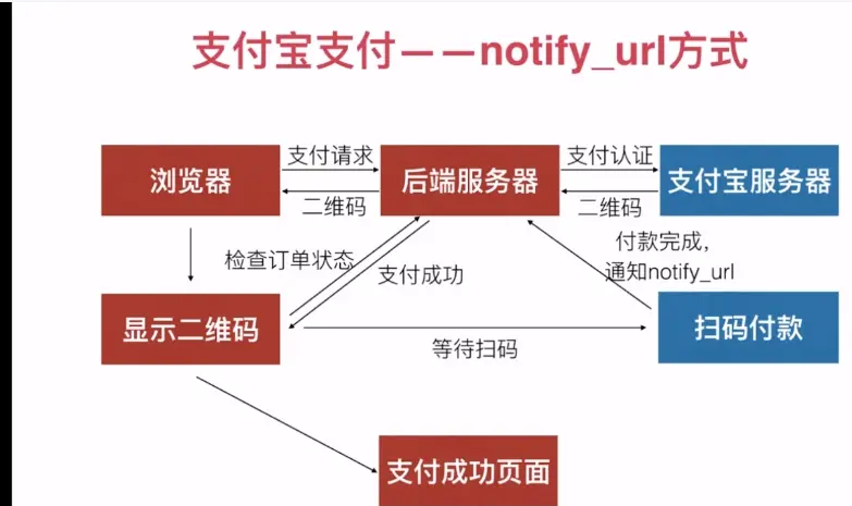 原理: 用户通过浏览器向后端服务器发送请求,后端服务器向支付宝服务器做个通信(支付宝服务器)来获取认证信息,支付宝服务器返回给后端服务器一个二维码(扫描支付),后端服务器把二维码返回给前台,二维码在浏览器中显示,等用户扫码付款(等待扫码的同时,前端不断的向后端检查订单状态,等待付款成功后,支付宝传到后台notify-url(得到 这个通知,前台就可以修改订单状态,订单支付成功,后端告诉页面订单支付成功--->页面就会跳到支付成功页面))