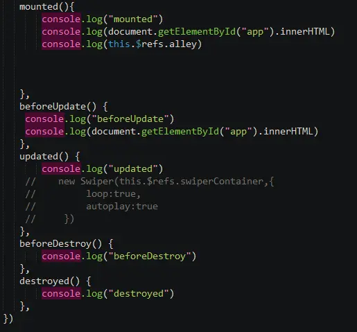 mounted:挂载后 数据与模板相结合完毕,已经渲染到页面上 当前生命周期我们可以获取到真实的DOM元素 一般的插件实例化的时候我们都会在mounted中去做