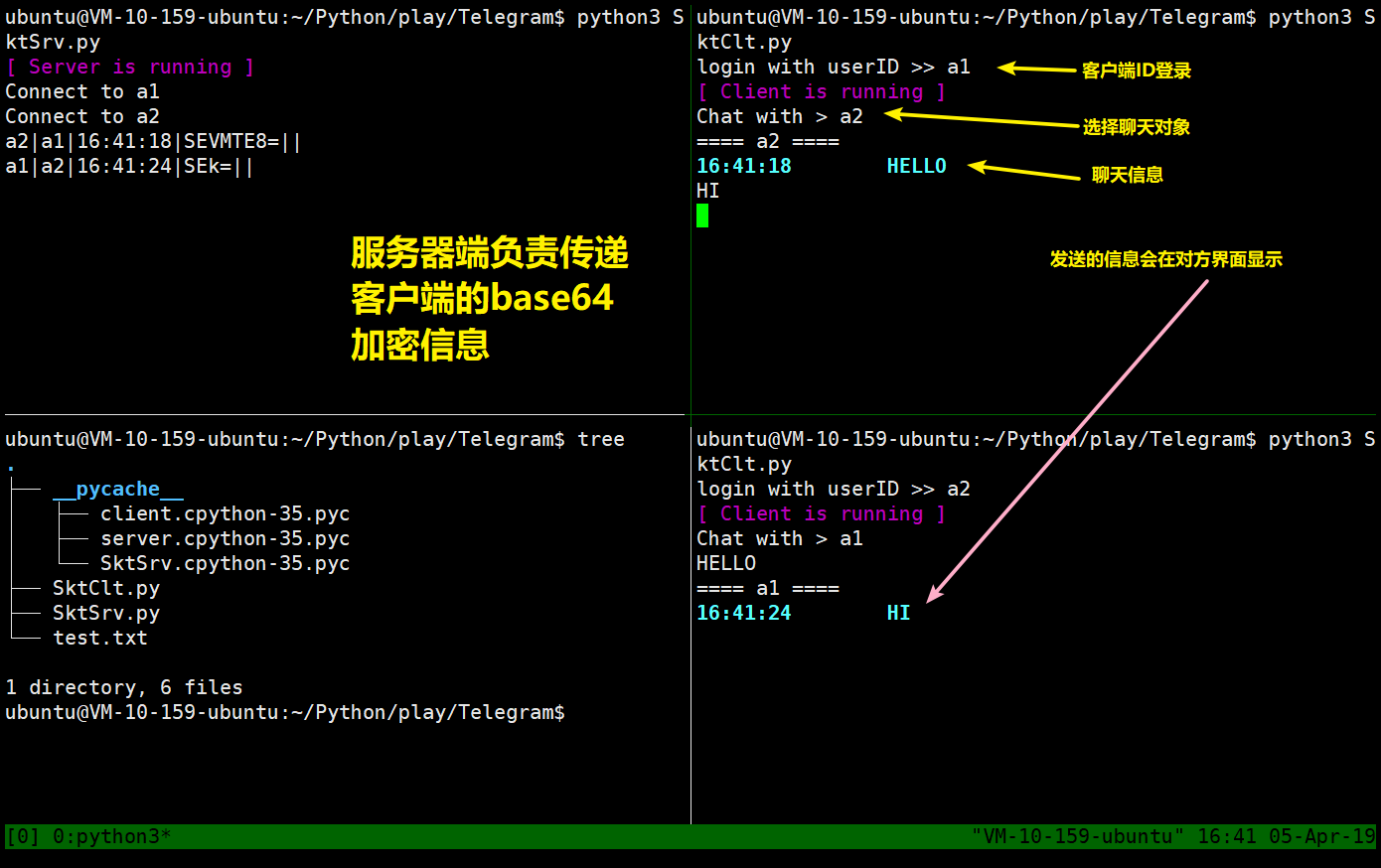 普通的聊天信息中不会出现管道符,但是代码和字符表情就不一定了∑( 口 ||,如果信息中出现了管道符就会导致协议解析失效,因此需要一种方法将msg中的|隐藏掉。思路是转义,但是这个需要手工重写协议解析代码,不够美观。由于之前了解过信息安全中的相关知识,还记得有一种编码方式是base64,由于base64编码结果不会出现管道符,那么问题就简单了,只需要用base64将传输信息重新编码一番。并且这是一种“即插即用”的方式,只要自定义base64的编码解码函数,然后嵌套在待发送msg的外面即可。
