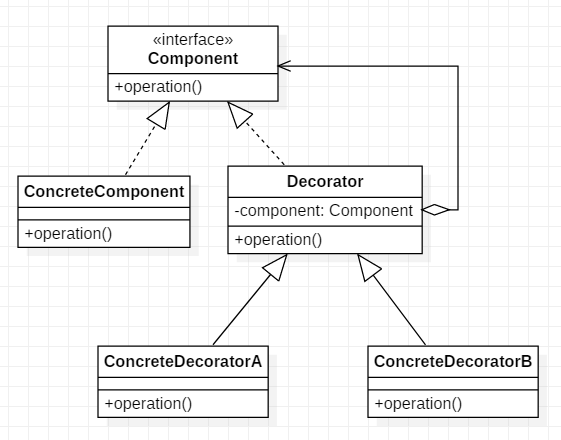 - 抽象装饰类(Decorator):持有一个指向Component实例的引用,并定义一个与Component接口一致的接口