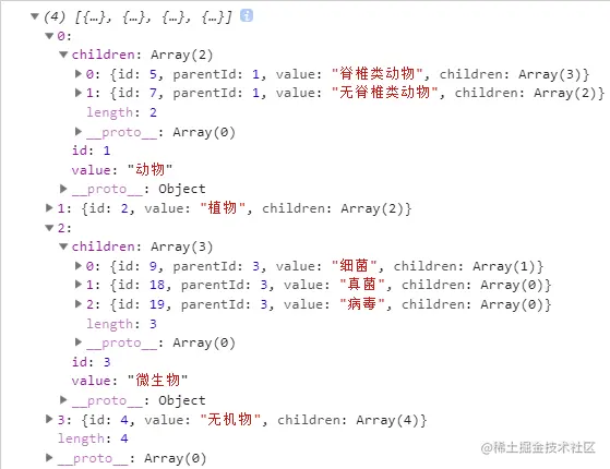 {id: 1, value: '动物'}, {id: 2, value: '植物'}, {id: 3, value: '微生物'}, {id: 4, value: '无机物'},