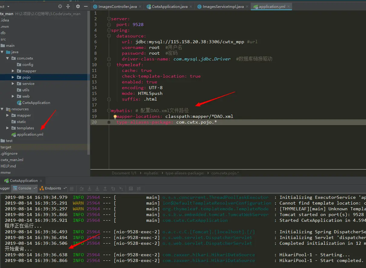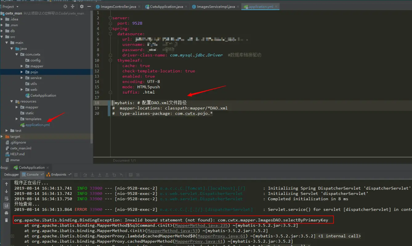 Spring Boot项目搭建DAO层找不到 Jason学长 2019-08-31 1,408 阅读1分钟 问题关键 问题出在mybatis的配置上 加上配置信息就好了 mybatis: # 配置DAO.xml文件路径 mapper-locations: classpath:mapper/*DAO.xml type-aliases-package: com.cwtx.pojo.*