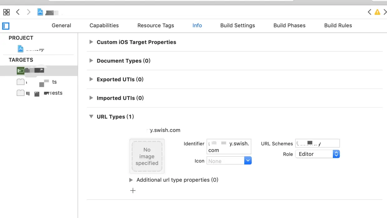 在调起Swish APP进行支付前,首先要配置当前应用的Scheme 如下图所示,在工程info下的URL Types配置URL Schemes,我这里写的是自己的应用名拼接swish.com,这里可以自定义,配置好即可