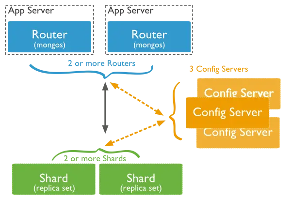 - Query Routers: 前端路由,客户端由此接入,且让整个集群看上去像单一数据库,前端应用可以透明使用。
