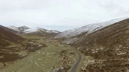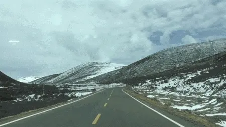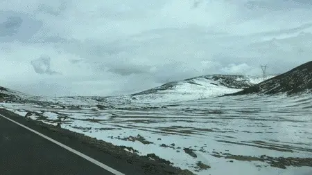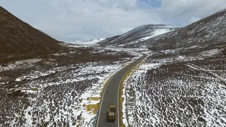 在去理塘的路上需要翻近5000米海拔的山。山下天晴,驾车蜿转着爬到山上,一个拐弯,眼前便是黑白蓝相间的一片。山体裸露凸出黑色的岩石灌木,而平缓处则积着还没来得及融化的积雪,再望远处和蓝天接壤的山顶则是终年不化的白雪,扣在黑黄相间的山上,就像一支巨大的奶油冰淇淋。