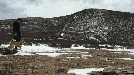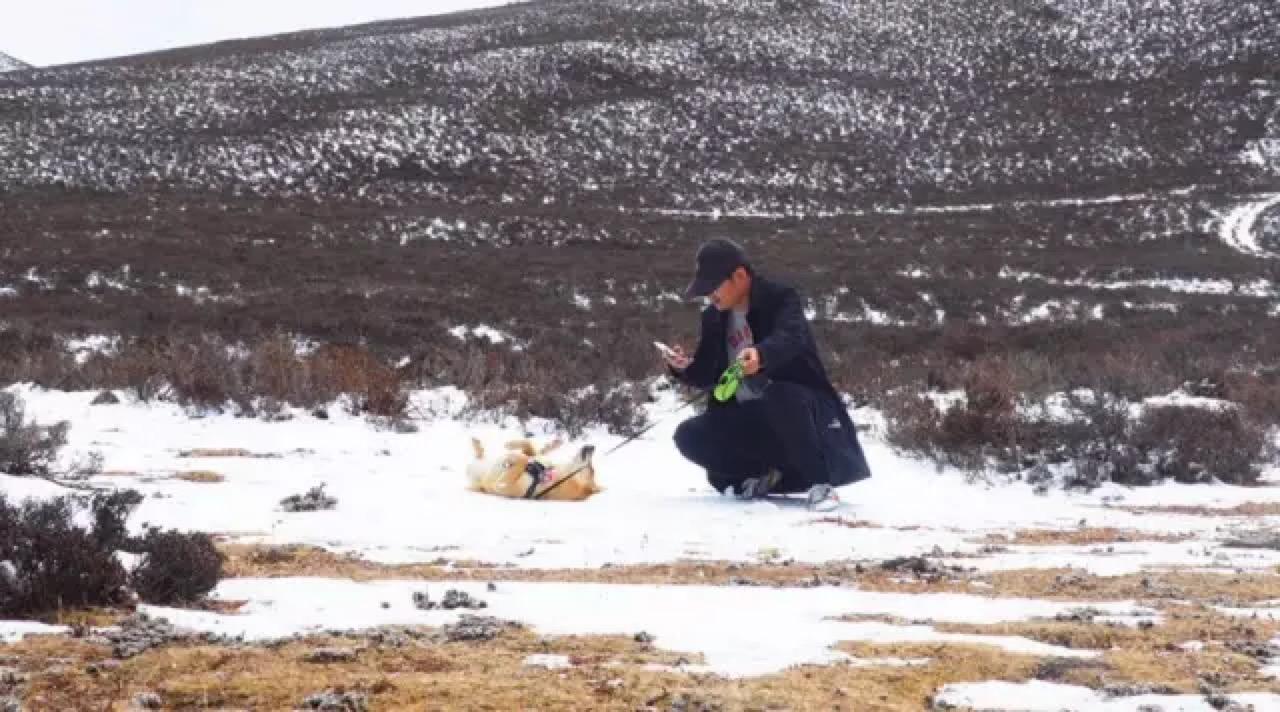 就在我航拍的时候,站在车引擎盖上的双喜突然暴走,跳下平时不敢下的车顶,窜过马路,淌过小河,疯狂地撵对岸的正在安静吃草的牦牛,围着牦牛边转圈边大吼大叫。近5000海拔要去追一只几百米开外的狗,着实累人,而且看双喜的样子,好像要把牦牛赶上山啊。