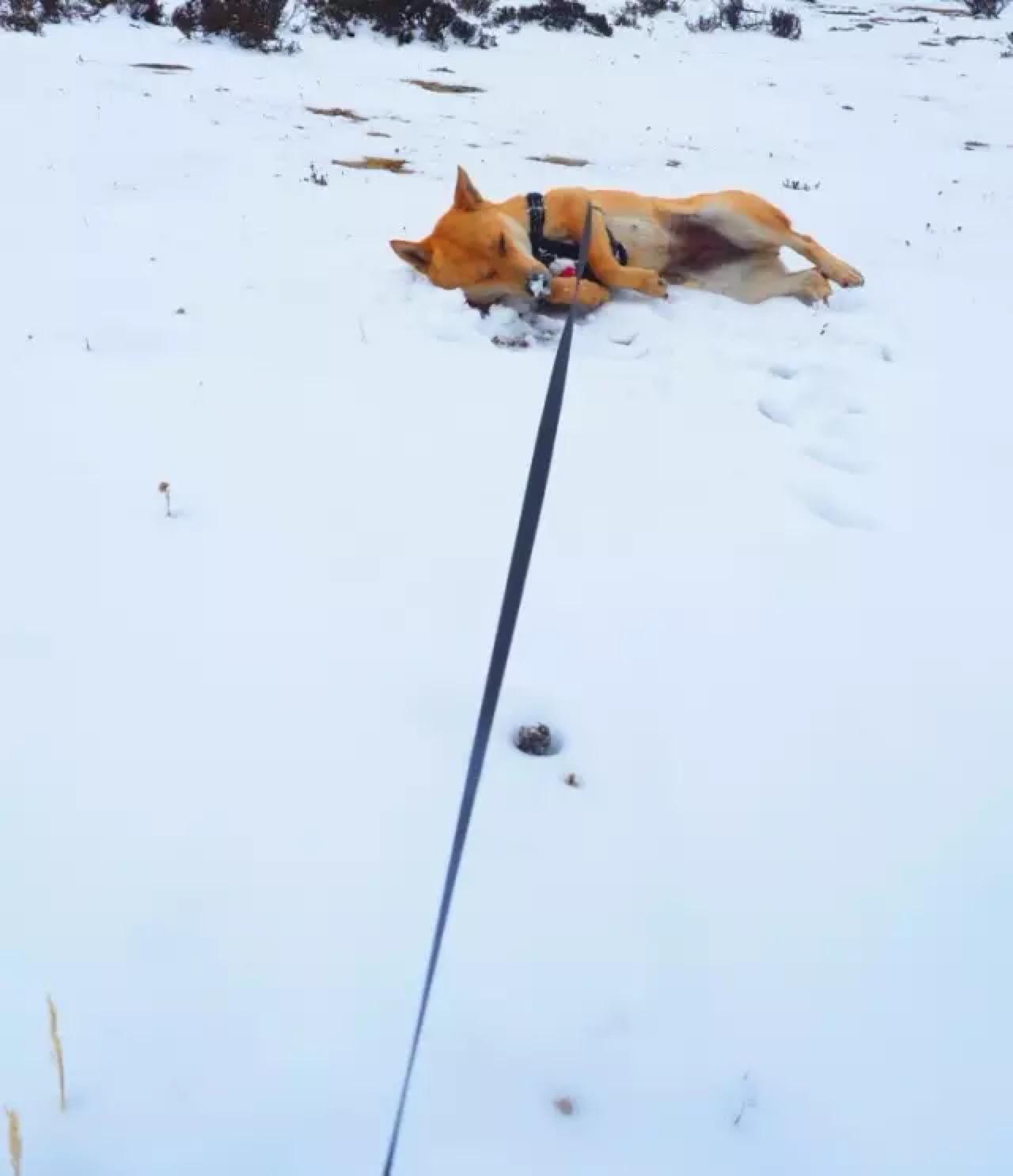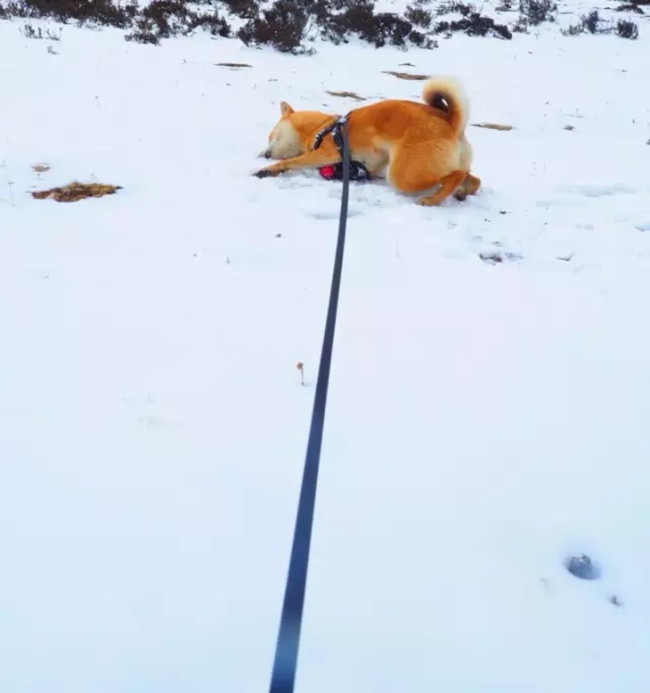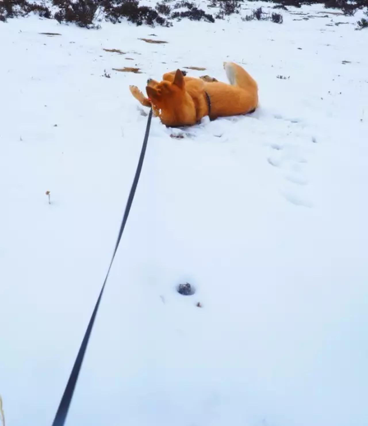 我停车把双喜抱进积雪处,这只热带的狗子第一次见积雪路面,先是一惊,紧接着抬起一只腿,另外三只小心翼翼地挪着无处安放。接着低头舔,咦,呀,越舔越快,突然猛地一跳,四只脚全踩在雪地里,然后发疯似地在雪地里打滚撒泼,将头和整个身子埋进雪里,嘴里呼嗤喘着气,怎么也拉不住。