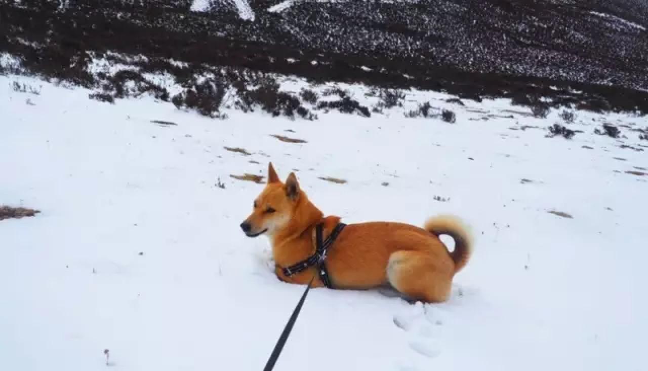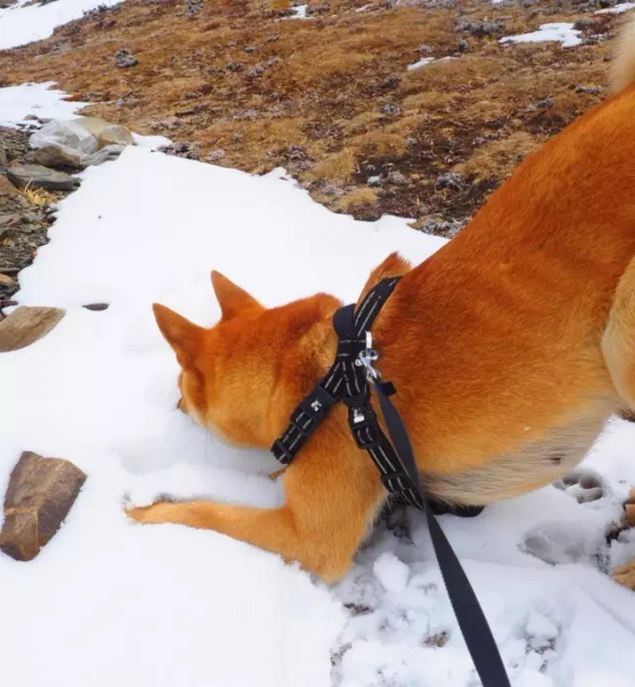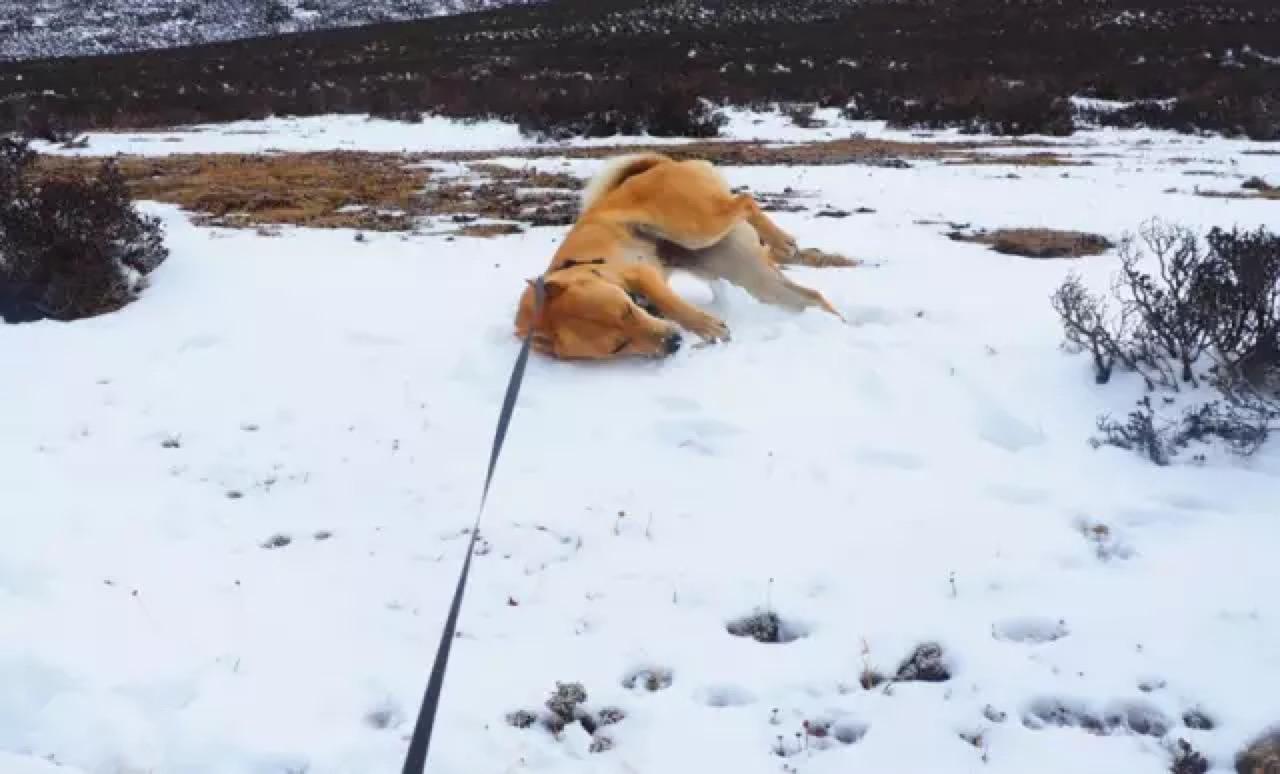 我停车把双喜抱进积雪处,这只热带的狗子第一次见积雪路面,先是一惊,紧接着抬起一只腿,另外三只小心翼翼地挪着无处安放。接着低头舔,咦,呀,越舔越快,突然猛地一跳,四只脚全踩在雪地里,然后发疯似地在雪地里打滚撒泼,将头和整个身子埋进雪里,嘴里呼嗤喘着气,怎么也拉不住。