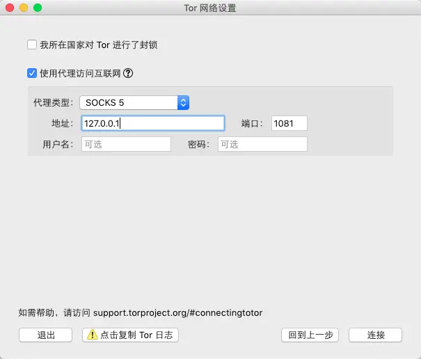 macOS 安装 TorBrowser y5050 2019-08-31 8,485 阅读1分钟 1,下载TorBrowser中文版本 TorBrowser-8.5.4-osx64_zh-CN.dmg下载 2,TorBrowser连接 使用代理,查看Local Socks5 Port 2.Tor Browser 配置代理 3,TorBrowser连接成功