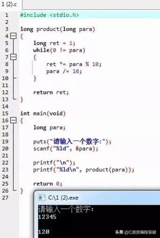 本篇程序参考代码“获取一个数字各位数的乘积”节选自“C语言解惑课堂”第12篇,更多C语言程序参考代码可微信扫扫文末卡片进入课堂学习!