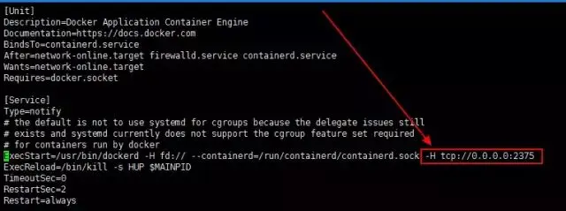 找到 ExecStart,在最后面添加 -H tcp://0.0.0.0:2375,如下图所示