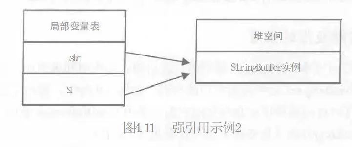 此时,如果再运行一 个赋值语句:StringBuffer strl=str; 那么,str所指向的对象也将被strl 所指向,同时在局部变量表上会分配空间存放strl 变量
