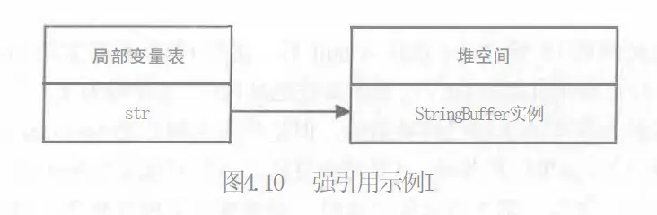 假设以上代码是在函数体内运行的,那么局部变量str将被分配在栈上,而对象StringBuffer实例被分配在堆上。局部变量str指向StringBuffer实例所在堆空间,通过str可以操作该实例,那么str就是StringBuffer实例的强引用