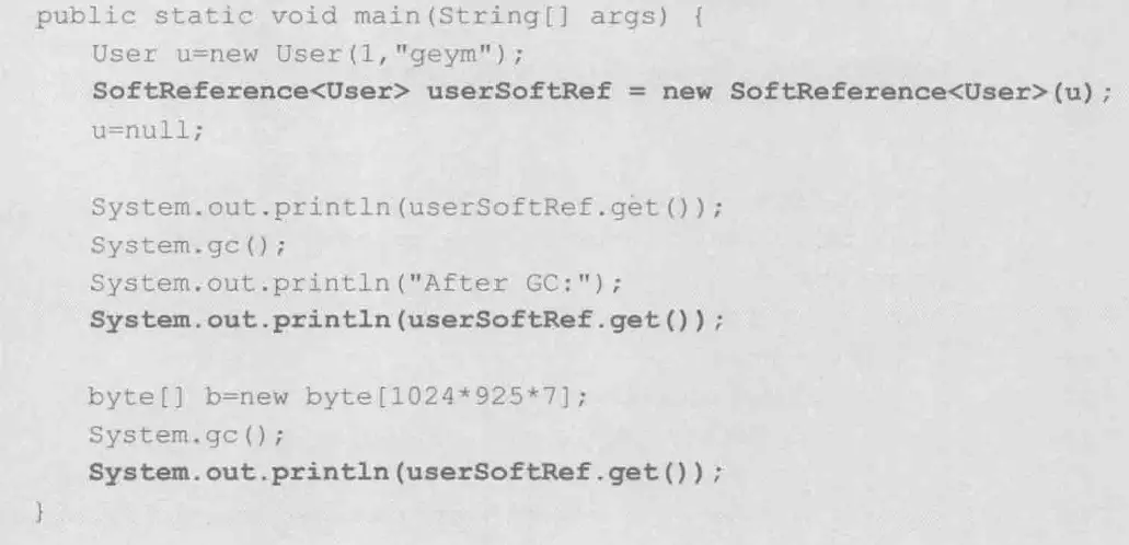 软引用是用来描述一些还有用但并非必需的对象。对于软引用关联着的对象,在系统将要发生内存溢出异常之前,将会把这些对象列进回收范围之中进行第二次回收。如果这次回收还没有足够的内存,才会抛出内存溢出异常。在JDK 1.2之后,提供了SoftReference类来实现软引用。一个对象只持有软引用,那么当堆空间不足时,就会被回收。