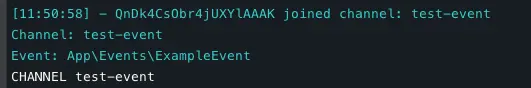 我们通过 JS 代码告诉程序我们订阅了名为 ’test-event' 的频道, 并监听 ‘ExampleEvent’ 事件 (这是事件的类名,你也可以根据你的需要自定义)。