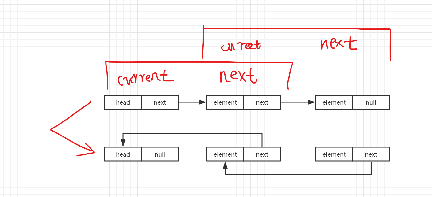 通过操作翻转前链表数据,每次取出current和next节点,创建新的节点设置翻转关系后,重复逻辑进行下一个节点的设置。