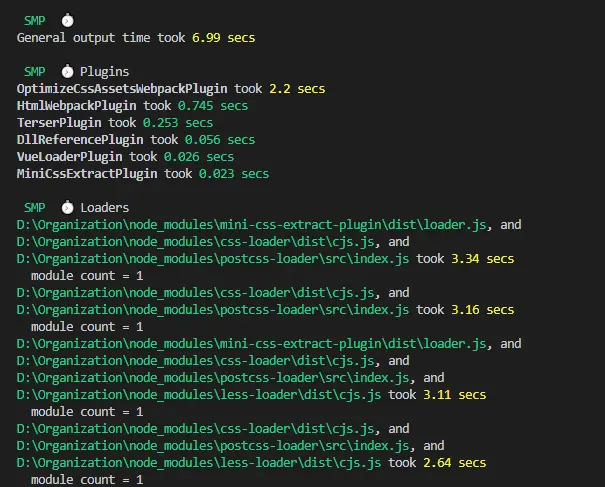 webpack打包耗时的大部分时间是因为loader预编译这一阶段,所以尽可能的少用loader,如下图