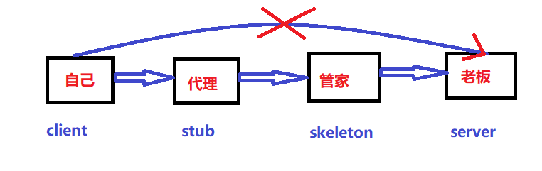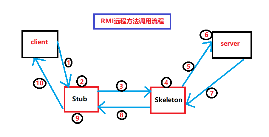 这就是整个流程,我是使用画图工具画的,不好看还请见谅。这里面涉及到了四个名词client、server、Stub、Skeleton。我们先对这4个名词先进性解释一下,然后再来看整个流程。