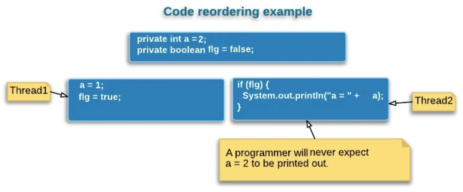 现代微处理器会通过指令乱序执行(out-of-order execution)来提升执行效率,除了处理器,Java自身的JIT编辑器也会对指令做重排序,最终生成的机器指令可能与字节码顺序并不一致。 在并发程序中,指令重排序可能会导致预期之外的执行结果,比如以下的程序,在多线程执行时,线程1中的语句可能会被乱序执行,flg=true可能会先于a=1被执行,则线程2可能会出乎意料地打印出 a = 2。
