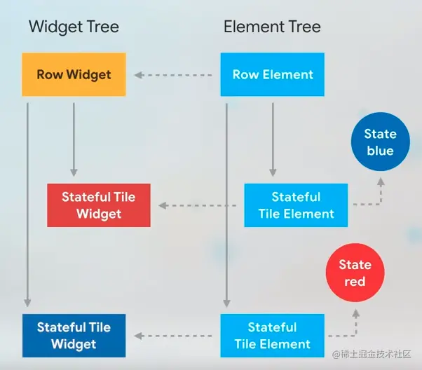 为了便于开发人员更好的控制Render Tree, 介于 Widget Tree, 和 Render Tree之间, Flutter Framework 生成了 Element Tree。 Element Tree 由 Widget提供的配置信息生成。