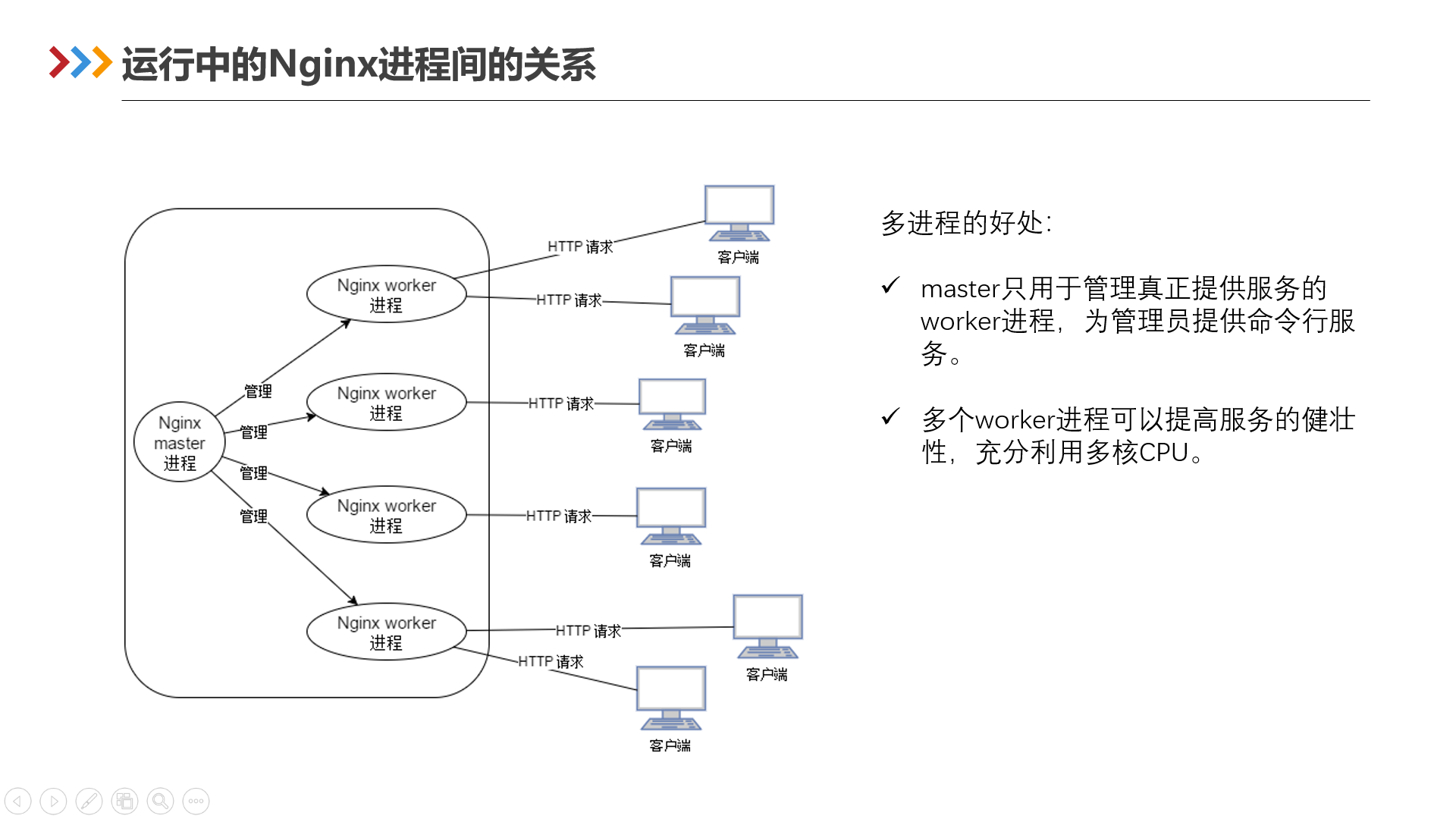 多个worker进程处理互联网请求不但可以提高服务的健壮性(一个worker进程出错后,其他worker进程仍然可以正常提供服务),最重要的是,这样可以充分利用现在常见的SMP多核架构,从而实现微观上真正的多核并发处理。因此,用一个进程(master进程)来处理互联网请求肯定是不合适的。