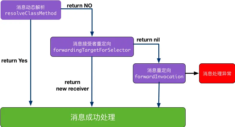 2.接收者找不到对应的selector,消息被转发或者临时向接收者添加这个selector对应的实现内容,否则崩溃