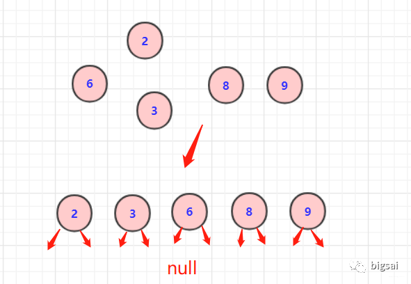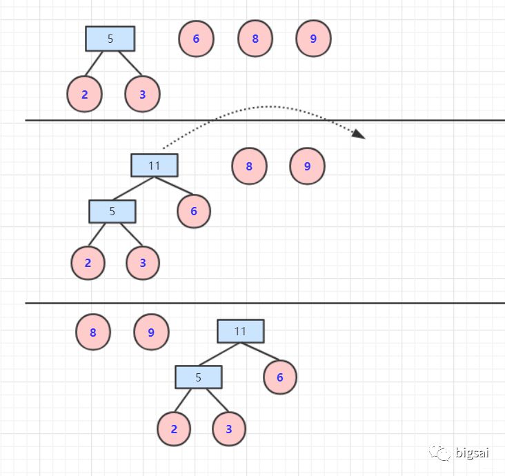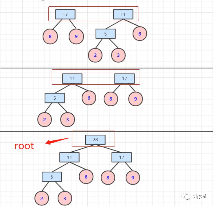 放入优先队列(自己排序也行)每次取两个最小权值顶点,构造父节点(value=left.value+right.value ).