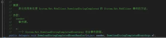 }在上述事例中,对于同步方法DownloadString,提供了一个异步变体方法DownloadStringAsync。当请求完成时会触发DownloadStringCompleted 事件,关于事件使用及描述前面文章已有详细介绍了。这个事件类型一共带有两个参数一个是object类型,一个是DownloadStringCompletedEventArgs类型。后面个这个类型通过Result属性返回结果字符串。