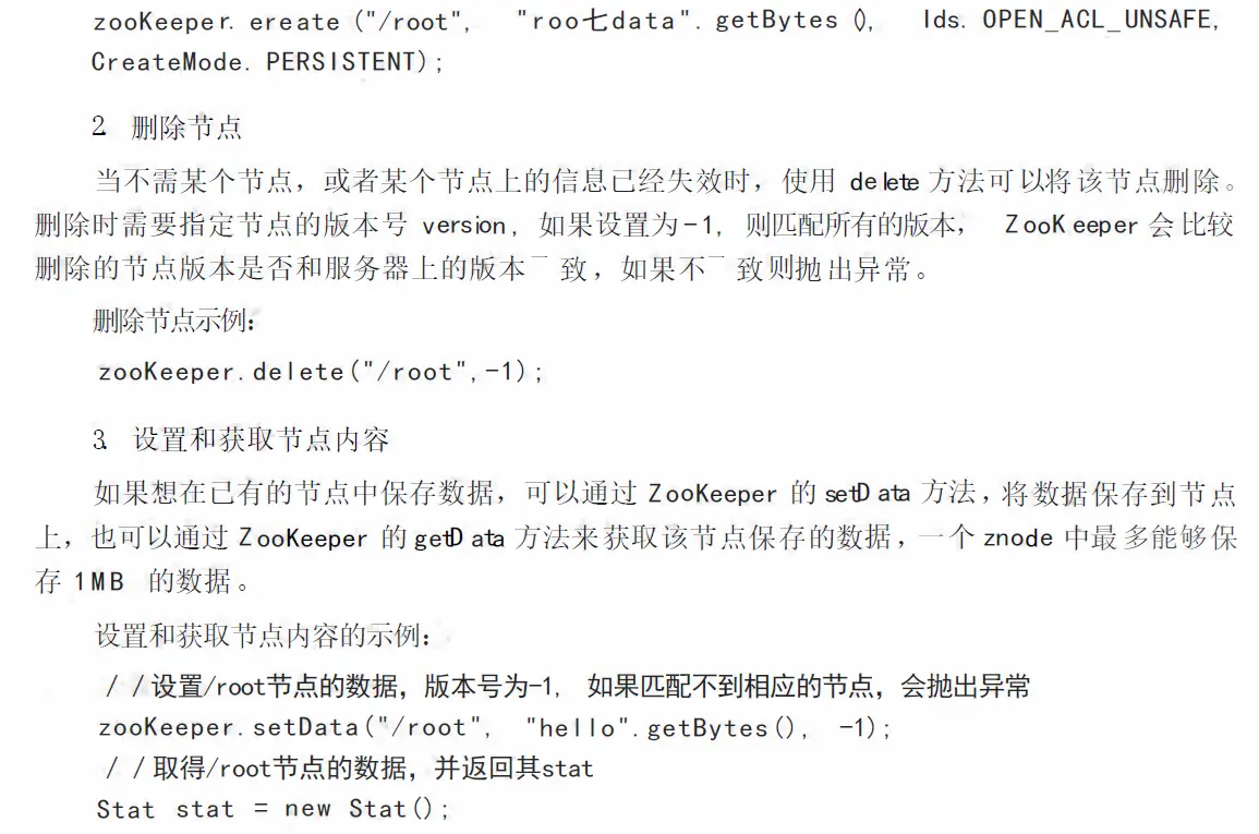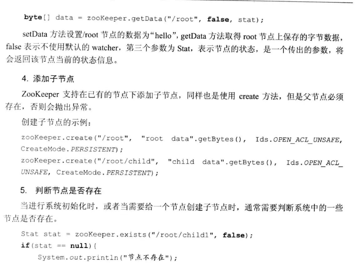 通过 ZooKeeper 的A PI新增一 个znode 节点,节点在被创建时,需要指定节点的路径 (此处为/root) 包含的字节数据 (这里指定的是 "root data" 这个字符串)、访问权限 (如果不想设置权限,则指定为 Ids.OPEN _ACL _UNSAFE), 以及创建的节点类型.