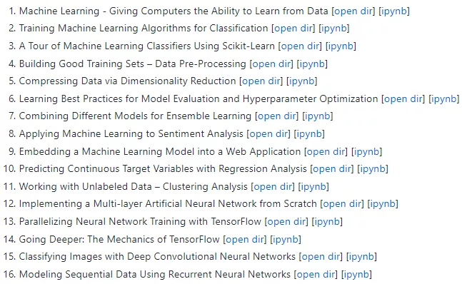 下面是翻译过来的中文目录:1. 赋予计算机从数据中学习的能力2. 训练机器学习分类算法3.使用Scikit-Learn的机器学习分类器之旅4. 建立良好的培训集-数据预处理5. 通过降维压缩数据6. 学习模型评估和超参数优化的最佳实践7. 结合不同的模型进行集成学习8. 将机器学习应用于情绪分析9. 将机器学习模型嵌入到Web应用程序中10. 用回归分析预测连续目标变量11. 处理未标记的数据-聚类分析12. 实现了一个多层人工神经网络从无到有13. 神经网络训练与张力流并行化14. 更深入:张力流的力学15. 利用深度卷积神经网络对图像进行分类16. 利用递归神经网络对序列数据进行建模