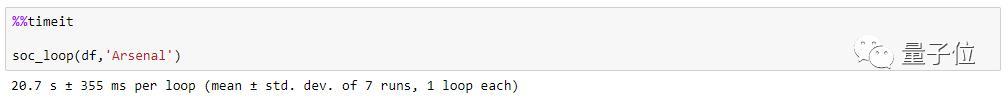 在这个案例中是阿森纳,在实现目标之前要确认阿森纳参加了哪些场比赛,是主队还是客队。但使用标准循环非常慢,执行时间为20.7秒。
