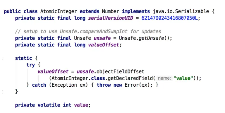 unsafe: 获取并操作内存的数据。 valueOffset: 存储value在AtomicInteger中的偏移量。 value: 存储AtomicInteger的int值,该属性需要借助volatile关键字保证其在线程间是可见的。接下来,我们查看AtomicInteger的自增函数incrementAndGet()的源码时,发现自增函数底层调用的是unsafe.getAndAddInt()。