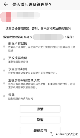 /** * 激活设备管理权限 成功执行激活时,DeviceAdminReceiver中的 onEnabled 会响应 */ private void activeManage() { // 启动设备管理(隐式Intent) - 在AndroidManifest.xml中设定相应过滤器 Intent intents = new Intent(DevicePolicyManager.ACTION_ADD_DEVICE_ADMIN); // 权限列表 intents.putExtra(DevicePolicyManager.EXTRA_DEVICE_ADMIN, componentName); // 描述(additional explanation) intents.putExtra(DevicePolicyManager.EXTRA_ADD_EXPLANATION, "------ 其他描述 ------"); startActivityForResult(intents, 0); }