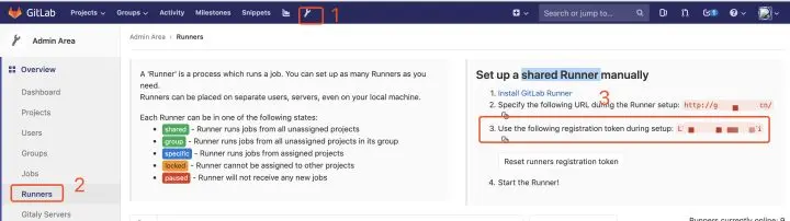 启动 gitlab runner 后还需要向Gitlab进行注册,在注册前需要从 gitlab 里查询 token。不同类型的 runner 对应的 token 获取的路径不同。shared Runner 需要 admin 权限的账号,按如下方式可以获取对应的 token。