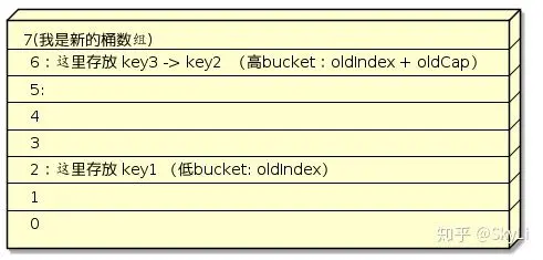 上图中两个示例图代表 JDK7 扩容前与扩容后元素转移位置图,转以后的 Node 是存在倒置问题的 (JDK8的转移后最终位置和上图相同,但元素同桶中转以后的元素位置与转移前的位置相同,即 6 桶中的 Node 的顺序将会是:key2 ->key3)。