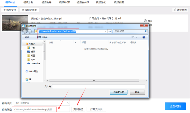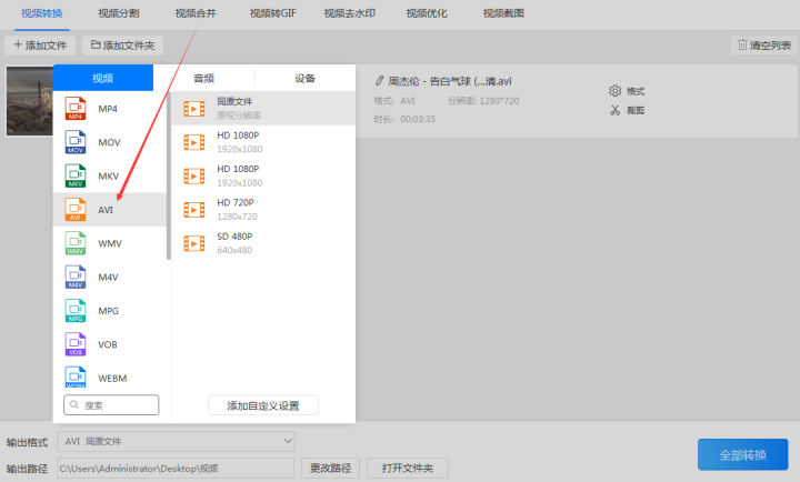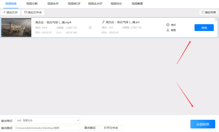 5、最后只需点击转换或全部转换按钮就可以把添加好的kux格式转换成avi格式了,转换完成后只需找到之前预设好的输出路径就可以找到输出的avi视频了。