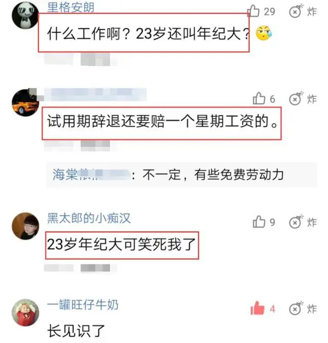 网友一:23岁就年纪大,可笑死我了,不过试用期被辞退应该是有赔偿的话,你完全可以自己争取一下,要是给你赔偿还好,不给赔偿自己也没什么损失。