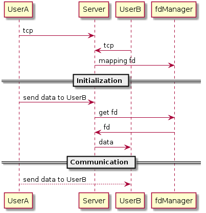 服务器接收到信息后根据客户端选择的 fd 将信息转发到对应的客户端 完成了用户A 和用户B 之间的通信