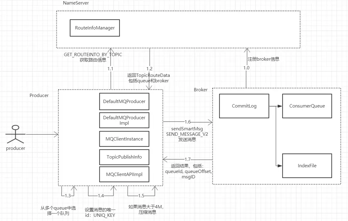 - producer向Broker发送rpc请求,将消息保存到broker端。消息头的code为SEND_MESSAGE或SEND_MESSAGE_V2(配置文件设置了特殊标志)