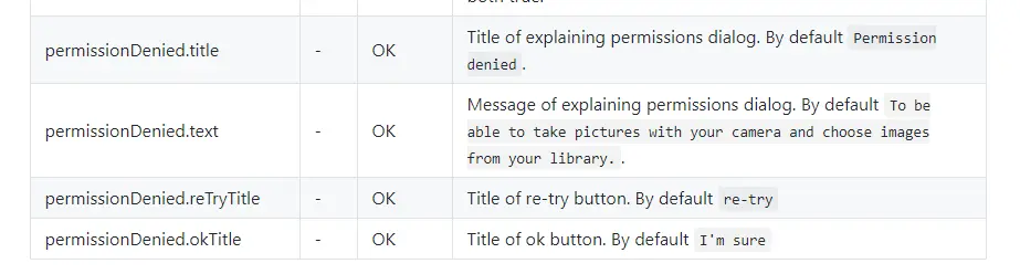 使用react-native-image-picker当用户拒绝权限时的提示信息默认为英文,要修改这些默认信息,参考官方文档