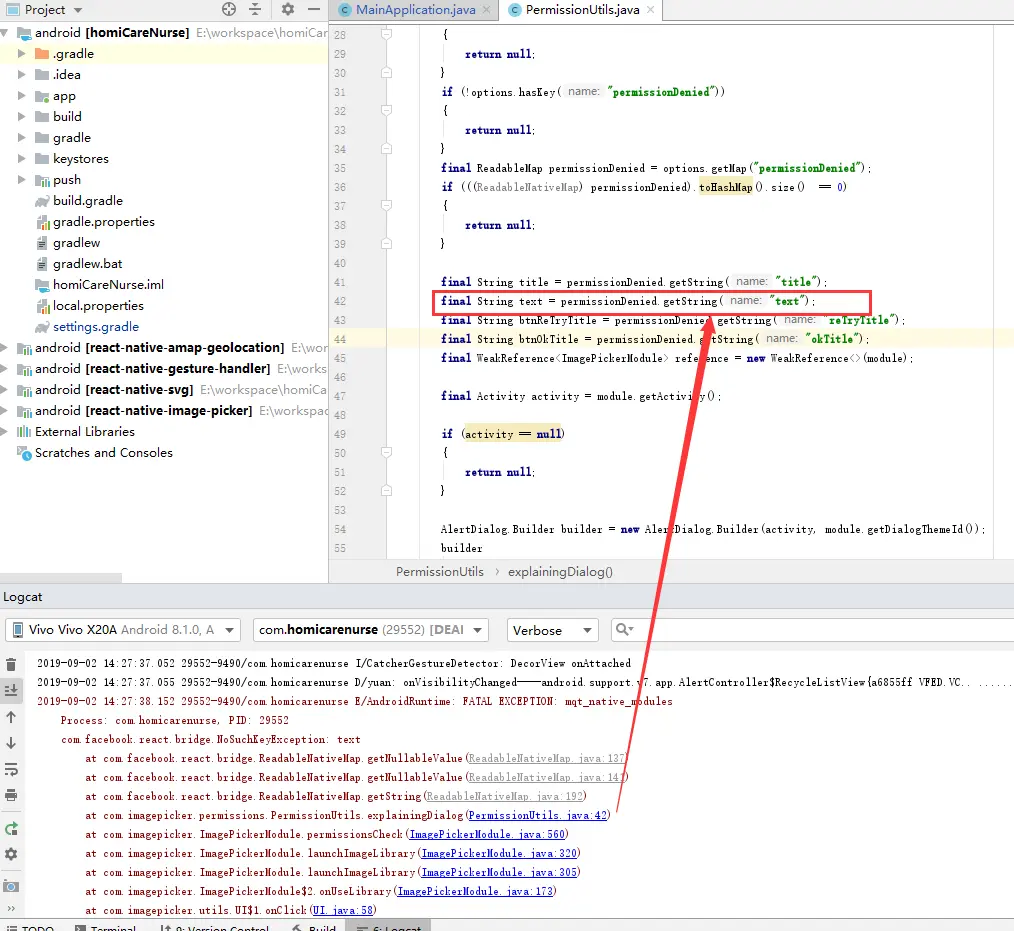 添加完之后在APP中选择照片功能会闪退,并且在Chrome的开发者工具中没有输出任何错误信息,只能通过Android Studio查看报错信息