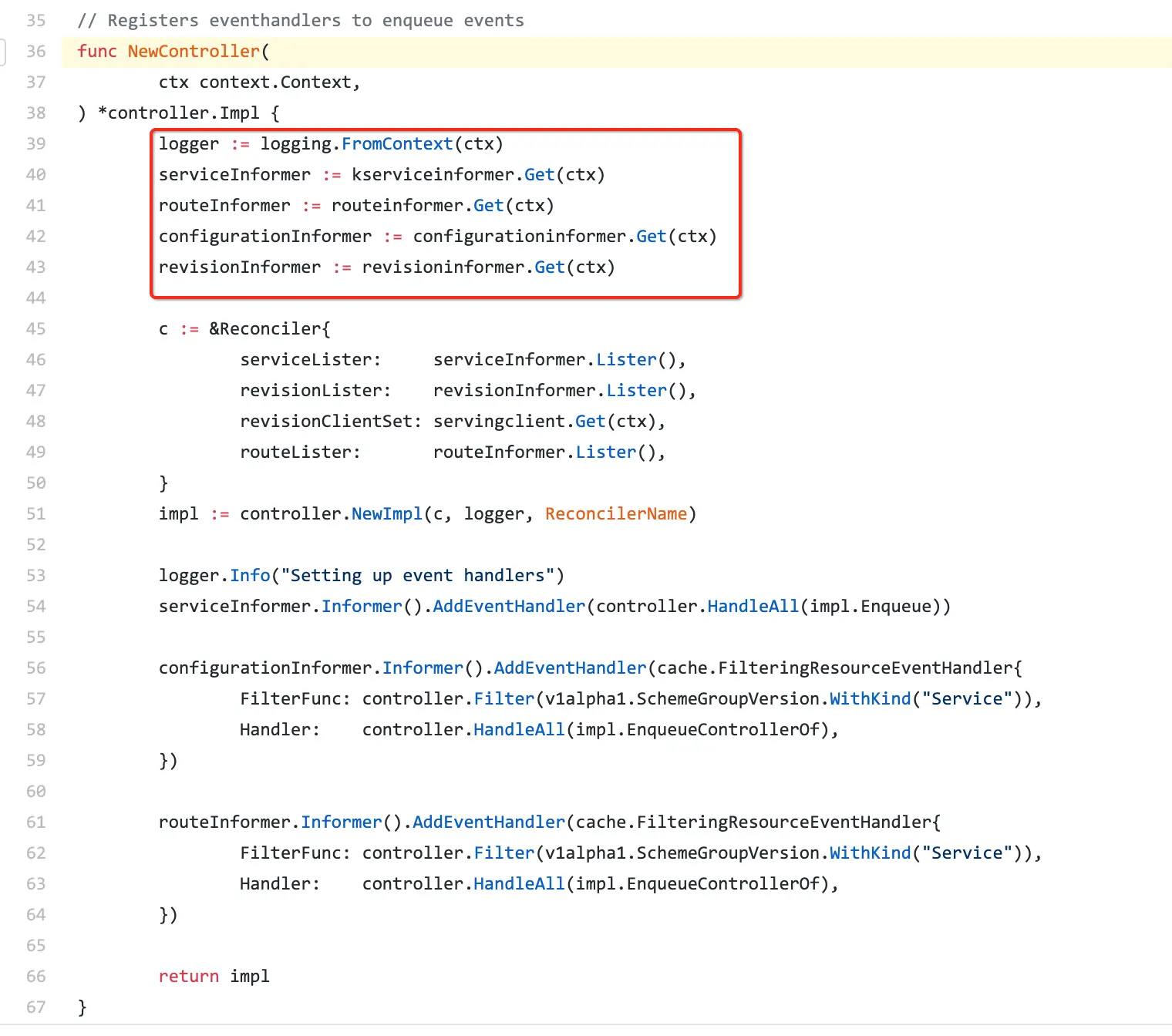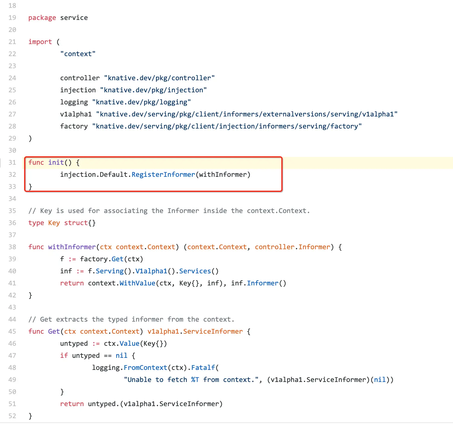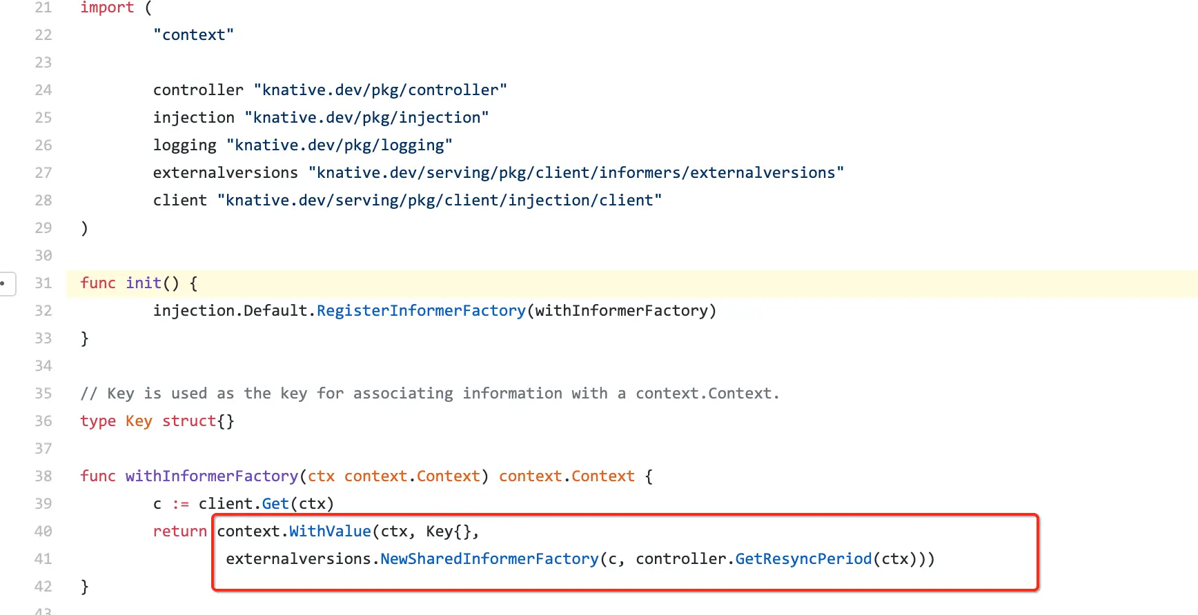 在 Context 的这些特性中,Knative Serving 中重度依赖的是 Value 功能。以 Service 的 Informer 初始化为例进行说明,这里可以看到源码。