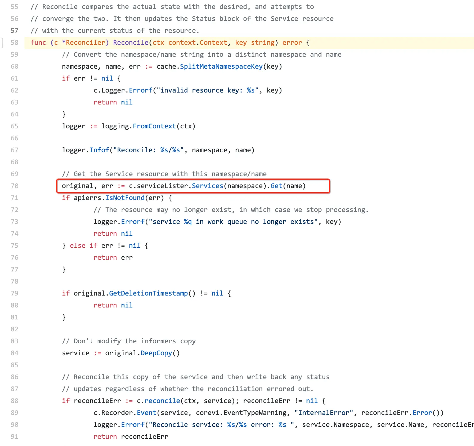 现在就可以在 Reconcile 中通过 c.serviceLister.Services(namespace).Get(name) 这种方式直接操作 Seving 资源了。
